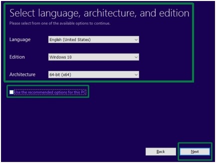 - If desired, the option to create media for Windows 10 Home- Single Language is available, but only select this option is you are running Windows 10 Home Single Language