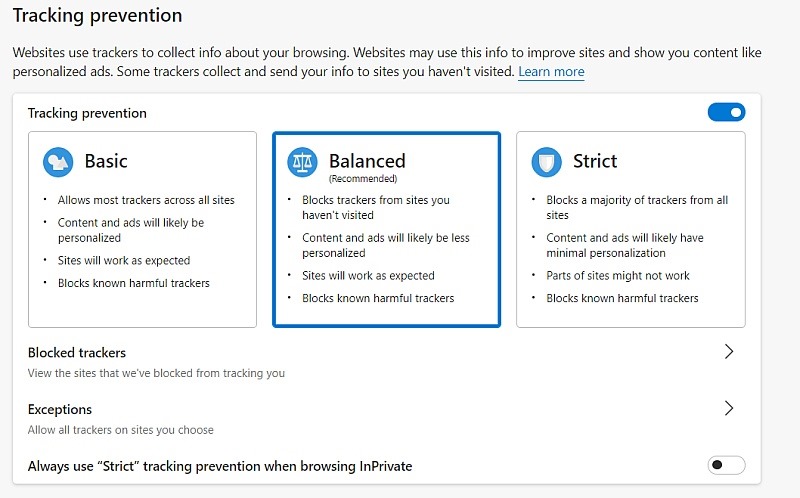 • Edge Chromium provides three different configuration options related to tracking privacy