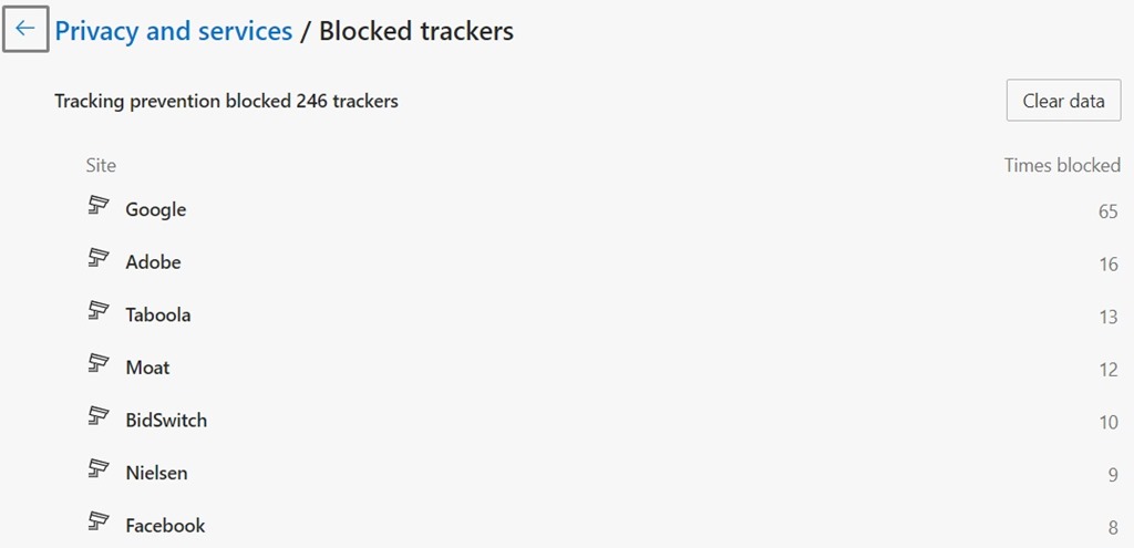 • Example of the ‘Blocked trackers’ results after casual surfing(over a 10 minute period) on the web across a variety of sites.  Note: The picture only shows the first seven(7) items in the available list.