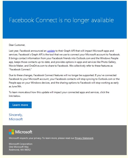 Facebook Connect across a variety of Microsoft services and applications will be discontinued and no longer available