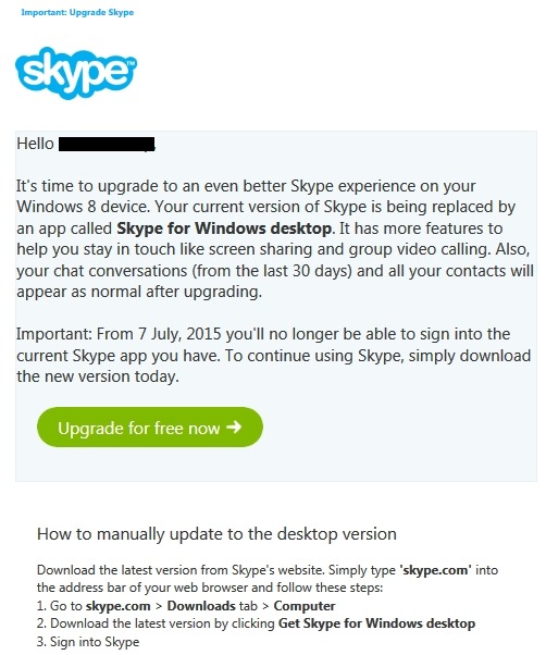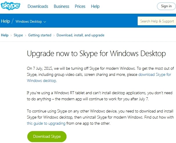 1. On July 7, 2015 Microsoft will turn off Skype for modern Windows